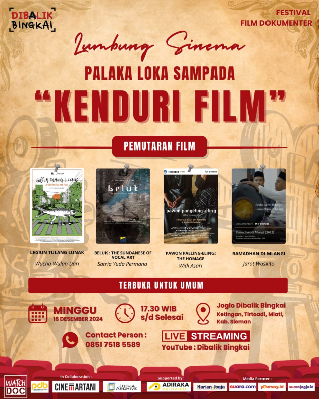 Dibalik Bingkai akan menggelar Kenduri Film sebagai perayaan dan pemutaran film dokumenter. Kenduri Film ini akan diadakan di Joglo Dibalik Bingkai, Dusun Ketingan, Tirtoadi, Sleman, Minggu (15/12/2024) pukul 17:30 hingga 21:30 WIB.